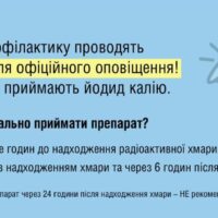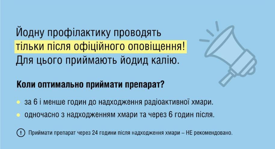 Приймати профілактичну дозу йодиду калію потрібно тільки після офіційного оповіщення місцевої влади про загрозу викиду та необхідність проведення йодної профілактики!
