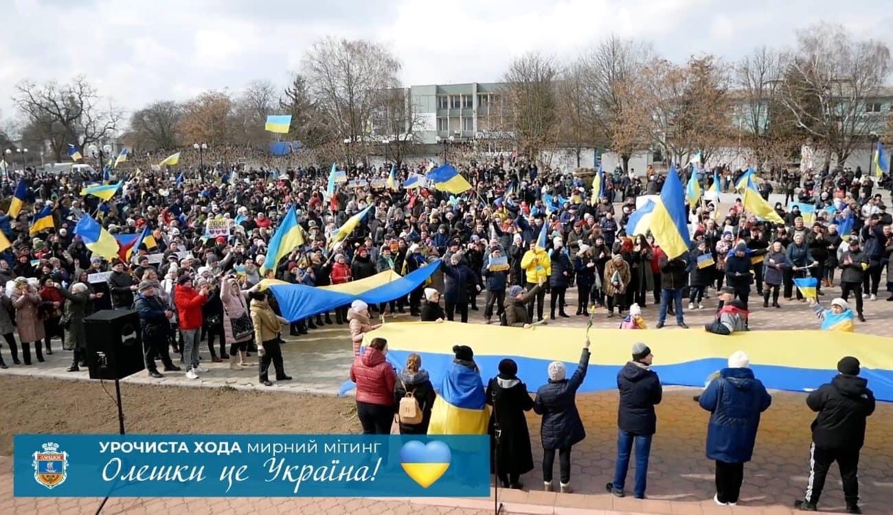 В Олешках упродовж березня залишався міський голова. Саме він 8 березня запропонував жителям вийти на мирний мітинг. Тоді на центральній площі зібралося майже все місто. Кожен – із жовто-блакитними прапорами, саморобними плакатами і настроєм відстояти своє, українське.