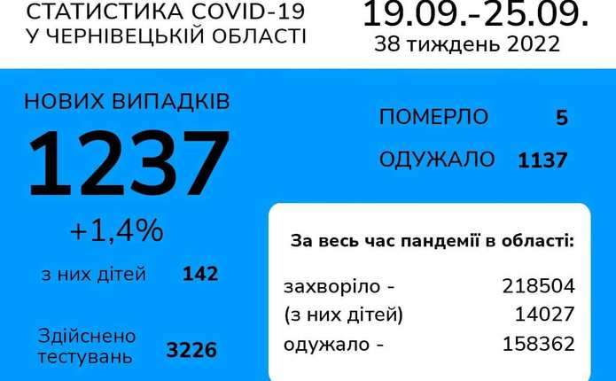 На Буковині за останній тиждень, із 19 по 25 вересня 2022 року, зафіксовано 1237 випадків коронавірусної хвороби. Серед тих, хто занедужав, 142 дітей. Про це повідомляє Чернівецький обласний центр контролю та профілактики хвороб.