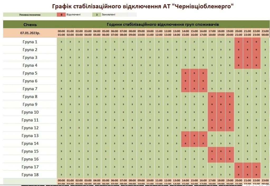 На 7 січня в області запровадили графік погодинних відключень. Це пов’язано зі значним зростанням споживання електроенергії. Про це повідомили в Чернівціобленерго.