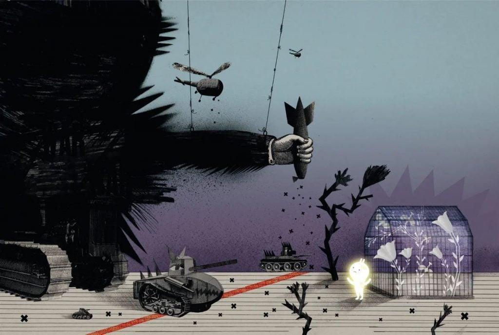 Книжка з ілюстраціями розповідає про містечко Рондо, де різнокольорові квіти співають і весело живуть разом із паперовими пташками та людьми-лампочками. Раптом темніє, в’їжджають танки, горять будинки. Настає війна.