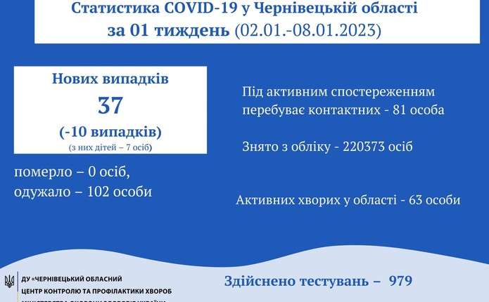 За результатами оперативного епідеміологічного аналізу за 1 тиждень 2023 року в Чернівецькій області зареєстровано 37 випадків COVID-19, в тому числі 7 випадків серед дітей. В порівнянні з попереднім, 52 тижнем 2022 року, відбулося зниження захворюваності на 10 випадків, одночасно, захворюваність серед дітей зросла на 1 випадок.