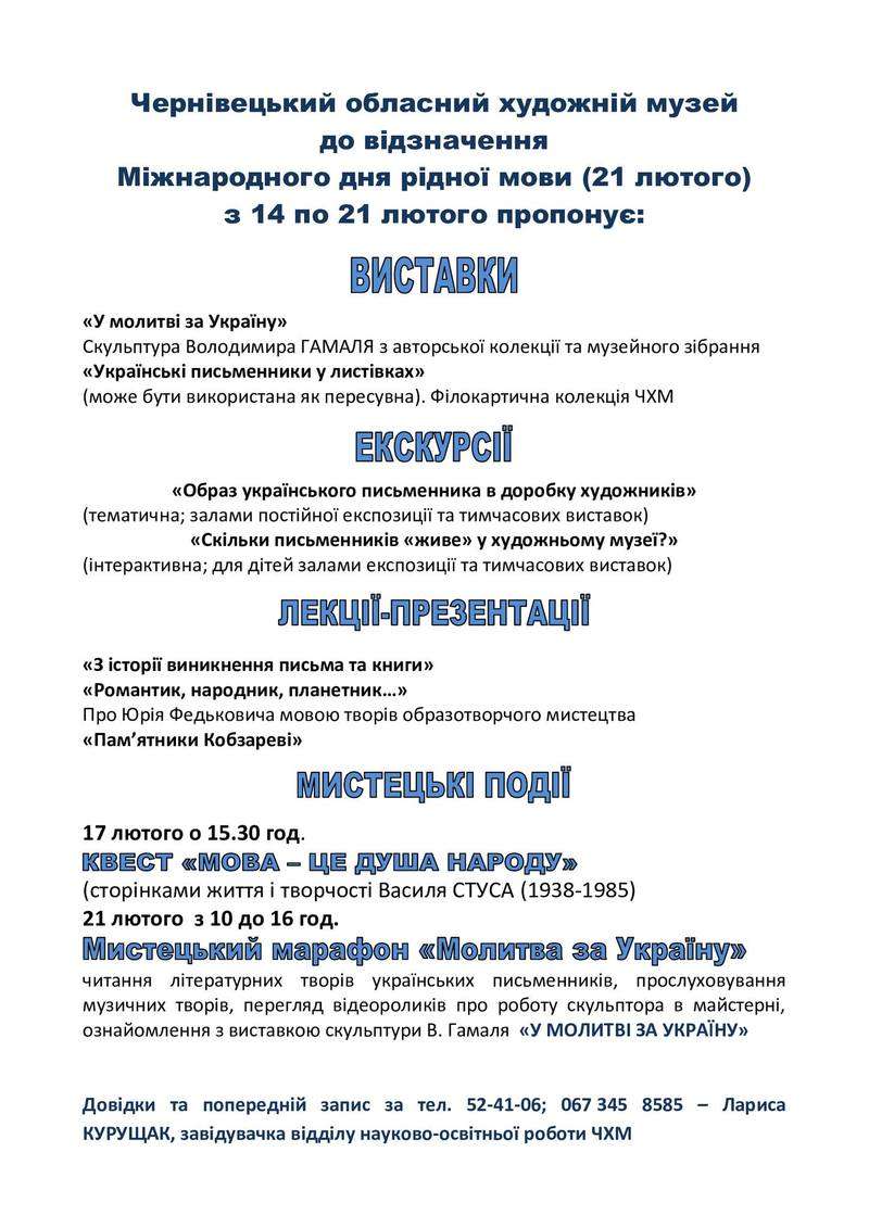 До Міжнародного дня рідної мови Чернівецький обласний художній музей підготував для чернівчан та гостей міста мистецькі заходи, які відбуватимуться упродовж тижня, з 14 по 21 лютого.