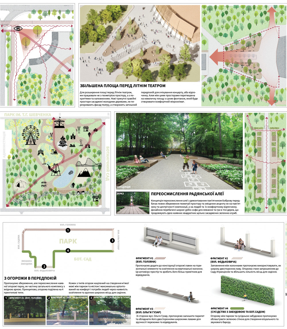 Архітектори пропонують змінити огорожу, що оточує парк, на місце для сидіння. Приберуть металеву огорожу з частини вулиць Федьковича і Гузар та встановлять там лавиці.