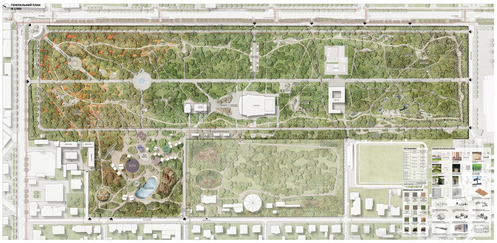 «Велика кількість різноманітних видів зелених насаджень робить із парку справжній ліс серед міста. Тому кожне нове втручан­ня спроєктовано з повагою до наявної рослинности, зберігає, або взаємодіє з нею», — йдеться у проєкті.