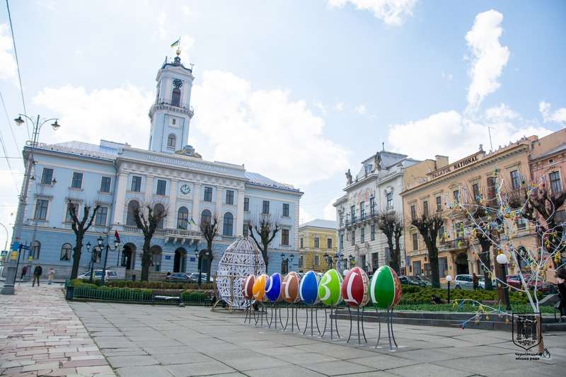 13 квітня 2023 року на Центральній площі Чернівців триває облаштування великодньої інсталяції. Встановлюють писанки, галунки та святкове дерево. Про це повідомляє Чернівецька міська рада у фейсбуці.