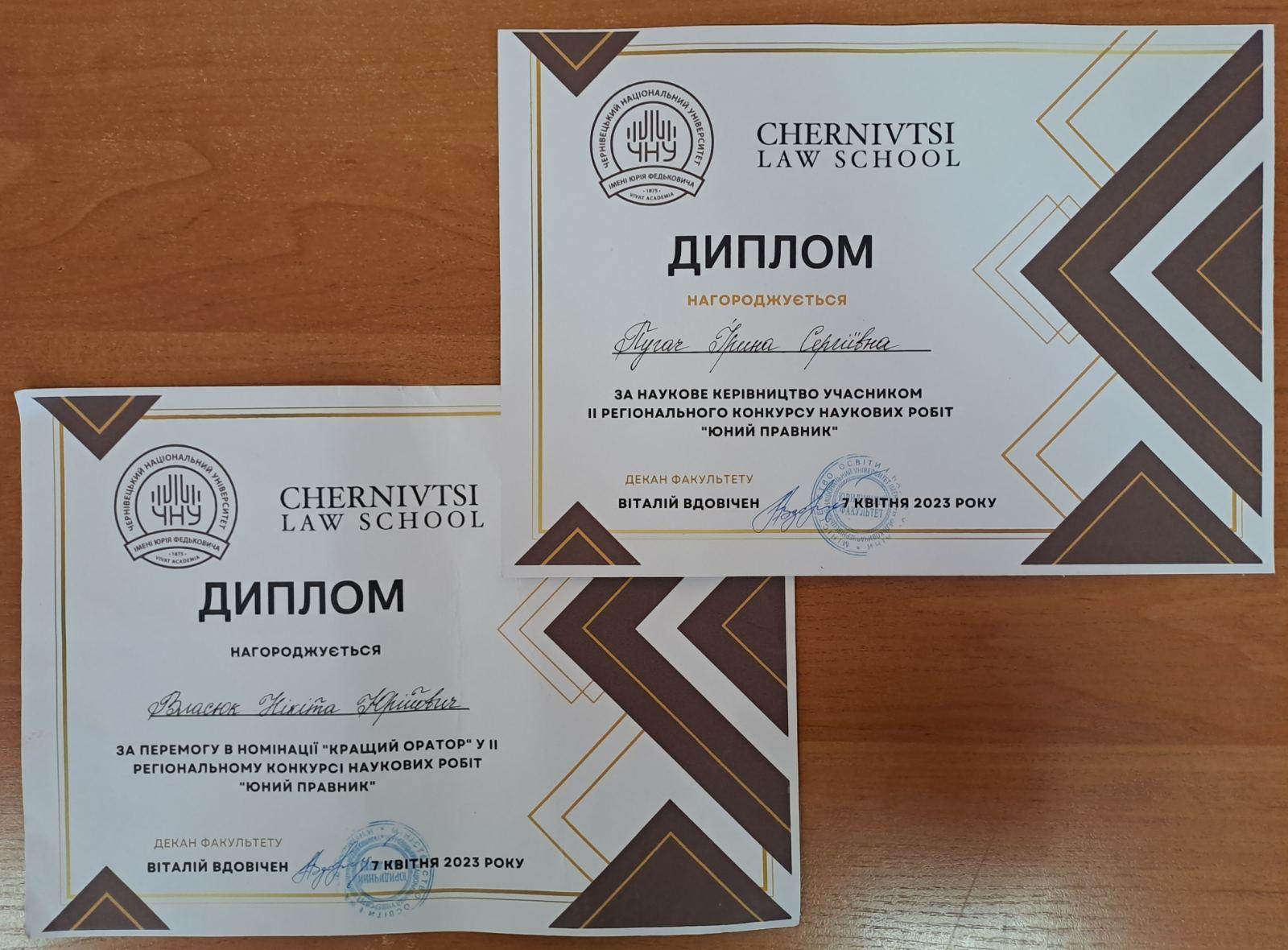 Серед них – і Нікіта Власюк, учень 10 класу Сокирянського ліцею спільно із науковим керівником, вчителем історії та правознавства Іриною Сергіївною Пугач,  які представили роботу у тематичному напрямку «Міжнародно – правовий захист прав людини у період збройних конфліктів».