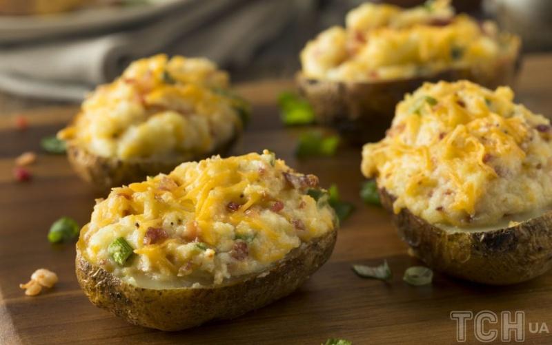 Заповніть цією сумішшю картоплю і запікайте в заздалегідь розігрітій духовці до 200 градусів 15-20 хвилин до утворення золотистої скоринки.