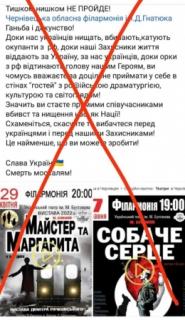 “Вистави “Майстер і Маргарита” та “Собаче серце” не були погоджені адміністрацією філармонії та Чернівецькою обласною військовою адміністрацією. Продаж квитків розпочали без нашого відома. Дані вистави у філармонії не відбудуться”, – йдеться у повідомленні від філармонії.