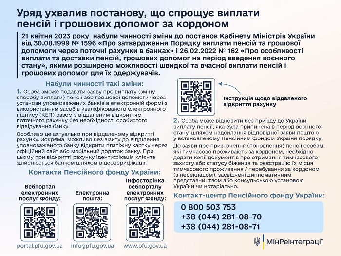 Уряд спростив механізм виплати українських пенсій і грошових допомог для тих одержувачів, які тимчасово проживають за кордоном. Про це йдеться на офіційному вебсайті Мінреінтеграції.