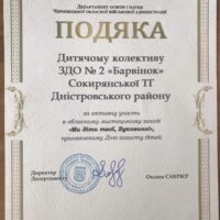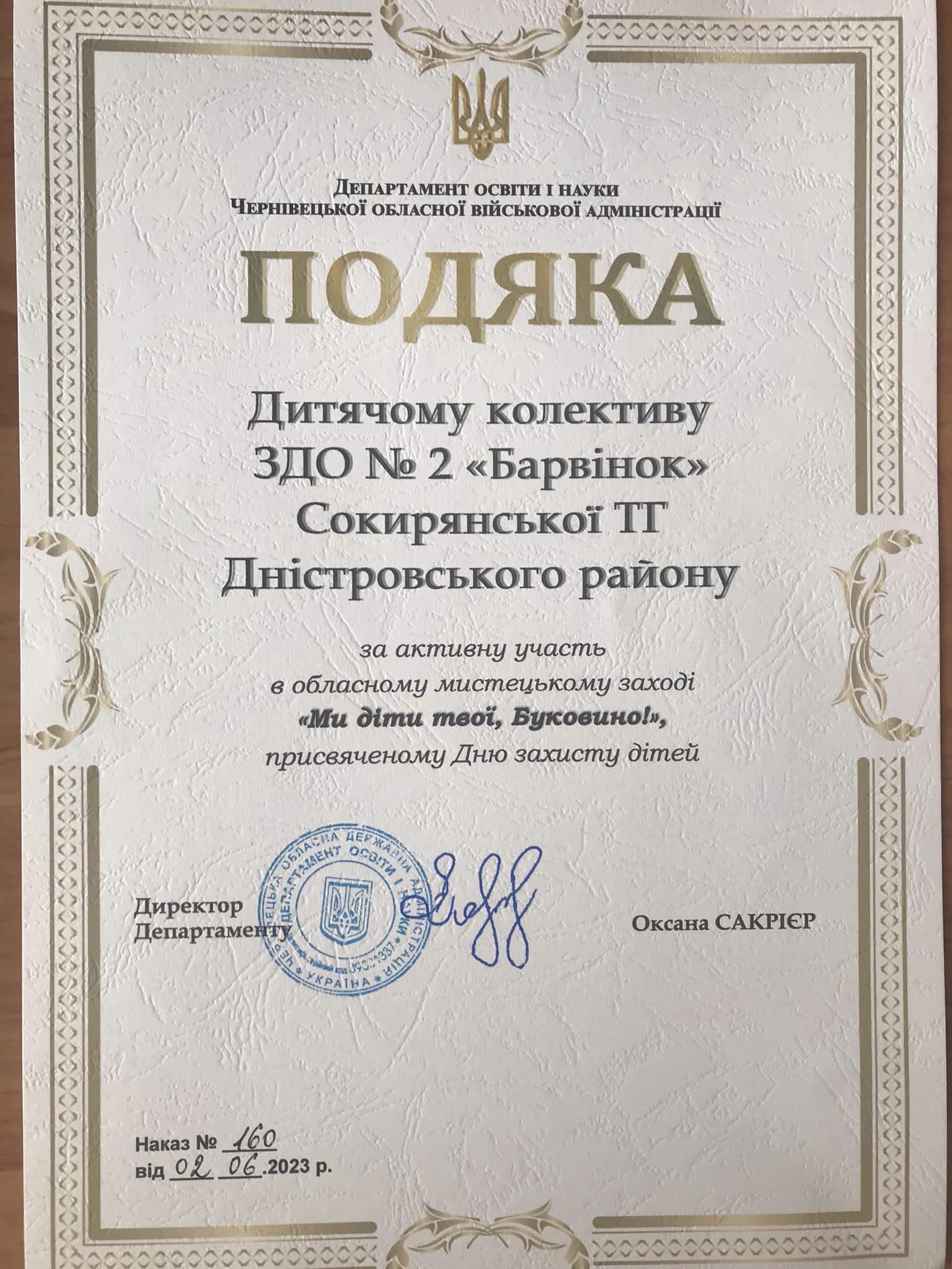 Днями у місті Чернівці відбулась мистецька подія приурочена Міжнародному дню захисту дітей під назвою «Ми діти твої, Буковино!». Свої неповторні таланти на сцені «Юності Буковини» презентували дошкільнята із 15 громад Чернівецької області. Урочистий захід розпочали юні хлопчики та дівчатка – вихованці закладу дошкільної освіти №2 «Барвінок» міста Сокиряни.