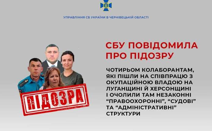 СБУ повідомила про підозру ще чотирьом колаборантам із Луганщини та Херсонщини, які пішли на співпрацю з ворогом та очолили окупаційні структури. Про це йдеться на офіційній фейсбук-сторінці відомства.