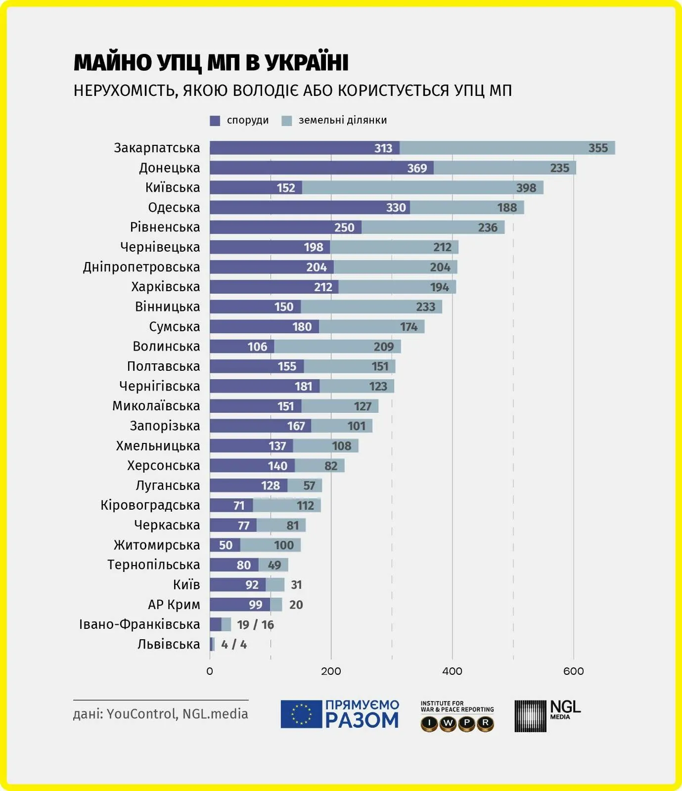 Незалежний антикорупційний центр «NGL.media» та ІТ-компанія «YouControl» зібрали інформацію про всю нерухомість, зареєстровану на Українську православну церкву Московського патріархату (УПЦ МП) в Україні. Дані взяті з держреєстрів станом на травень 2023 року.