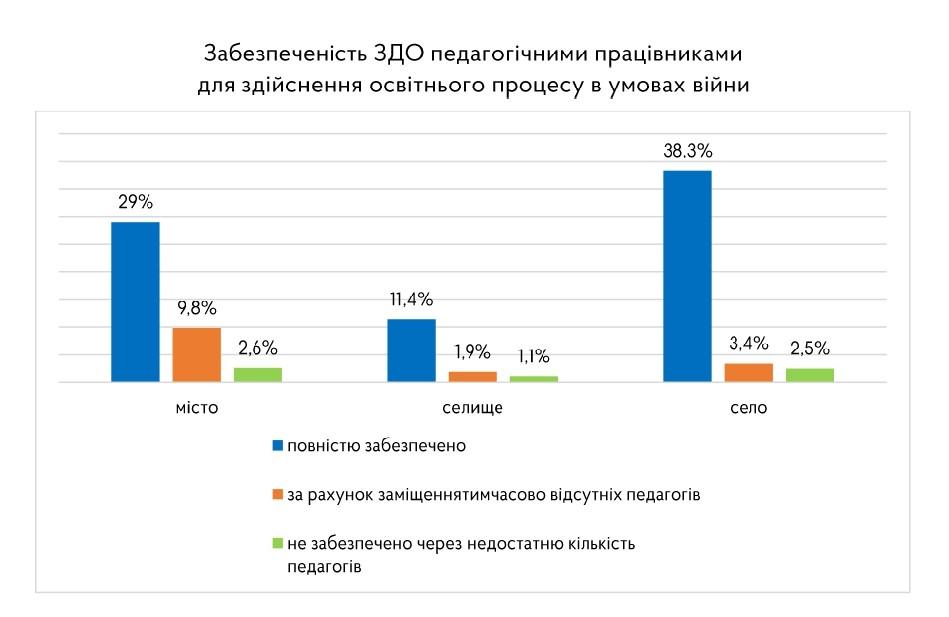 79% керівників зазначили, що ЗДО повністю забезпечені педагогічними працівниками; 15% – за рахунок заміщення тимчасово відсутніх педагогів, однак у 6% ЗДО педагогічних працівників бракує. Зміни у складі та кількості педагогічних працівників спричинені звільненням (22%), перебуванням на простої (20%), наданням відпусток без збереження заробітної плати (12%).