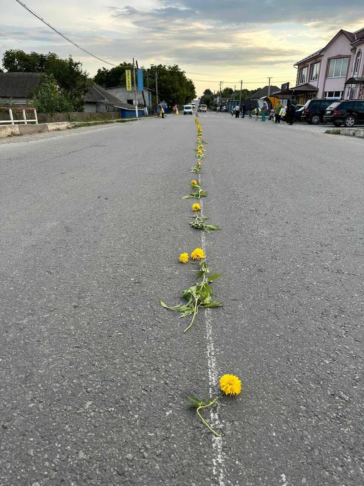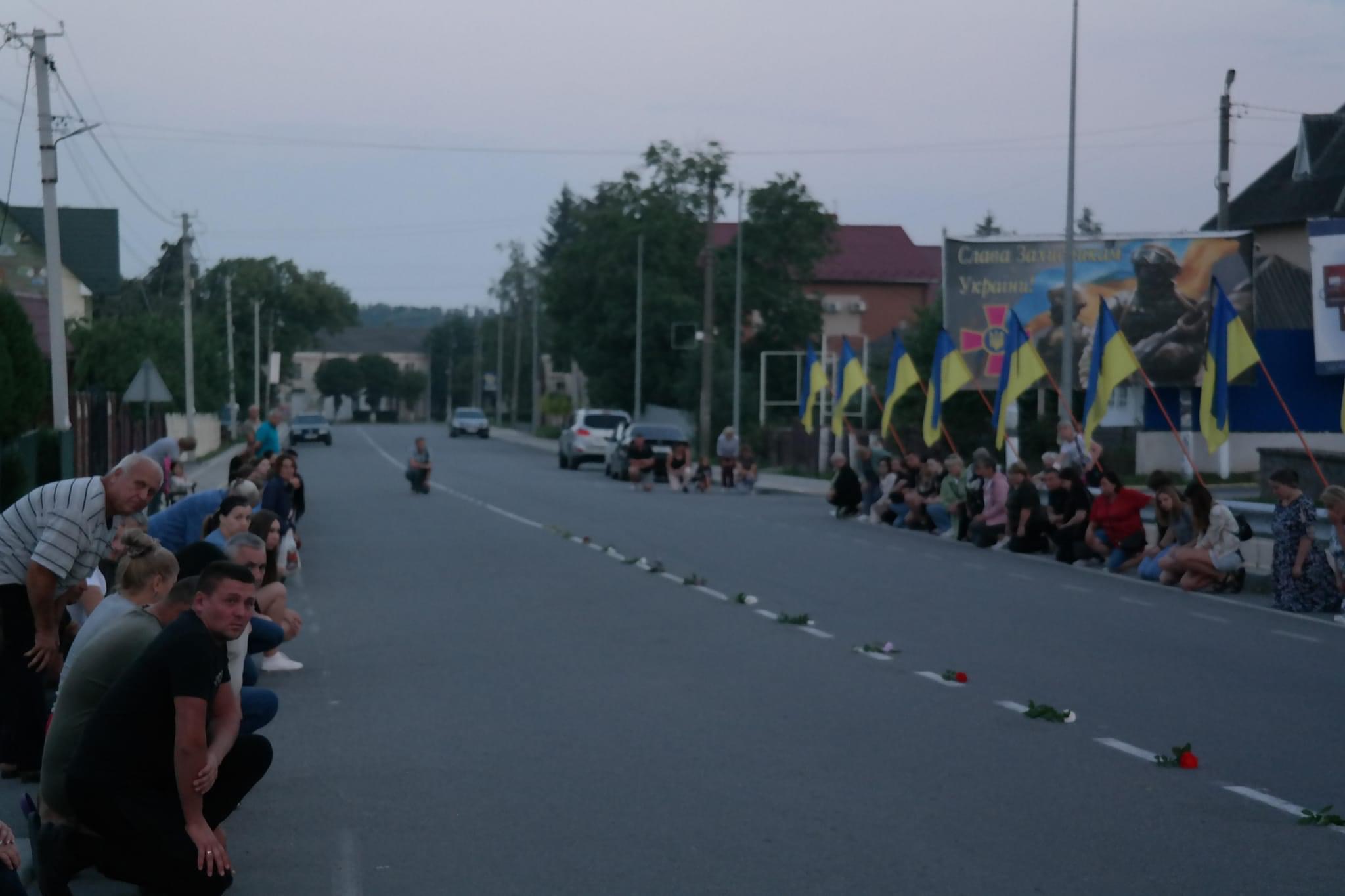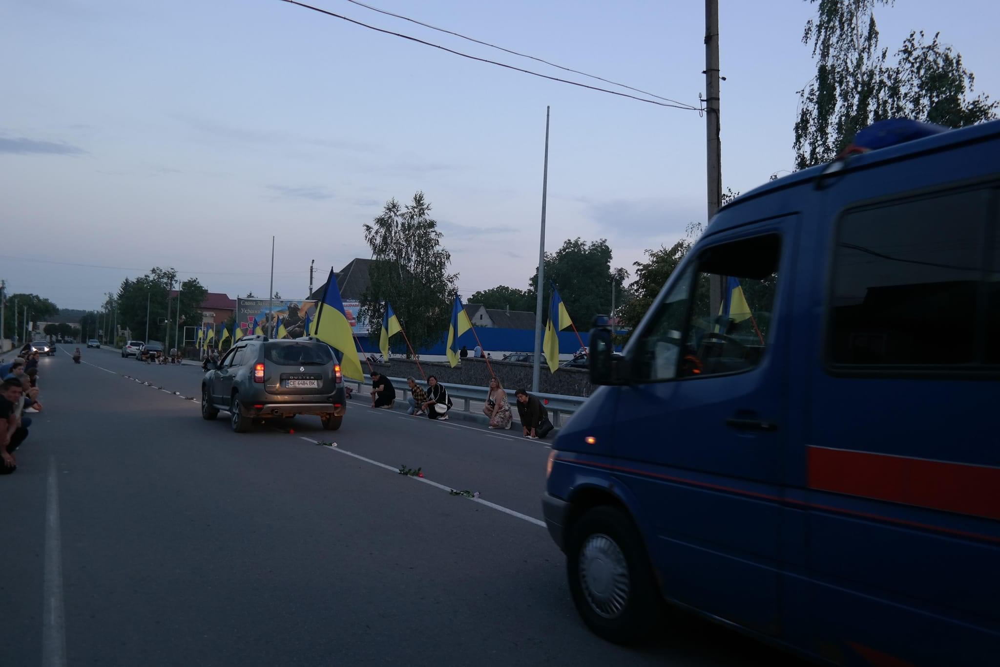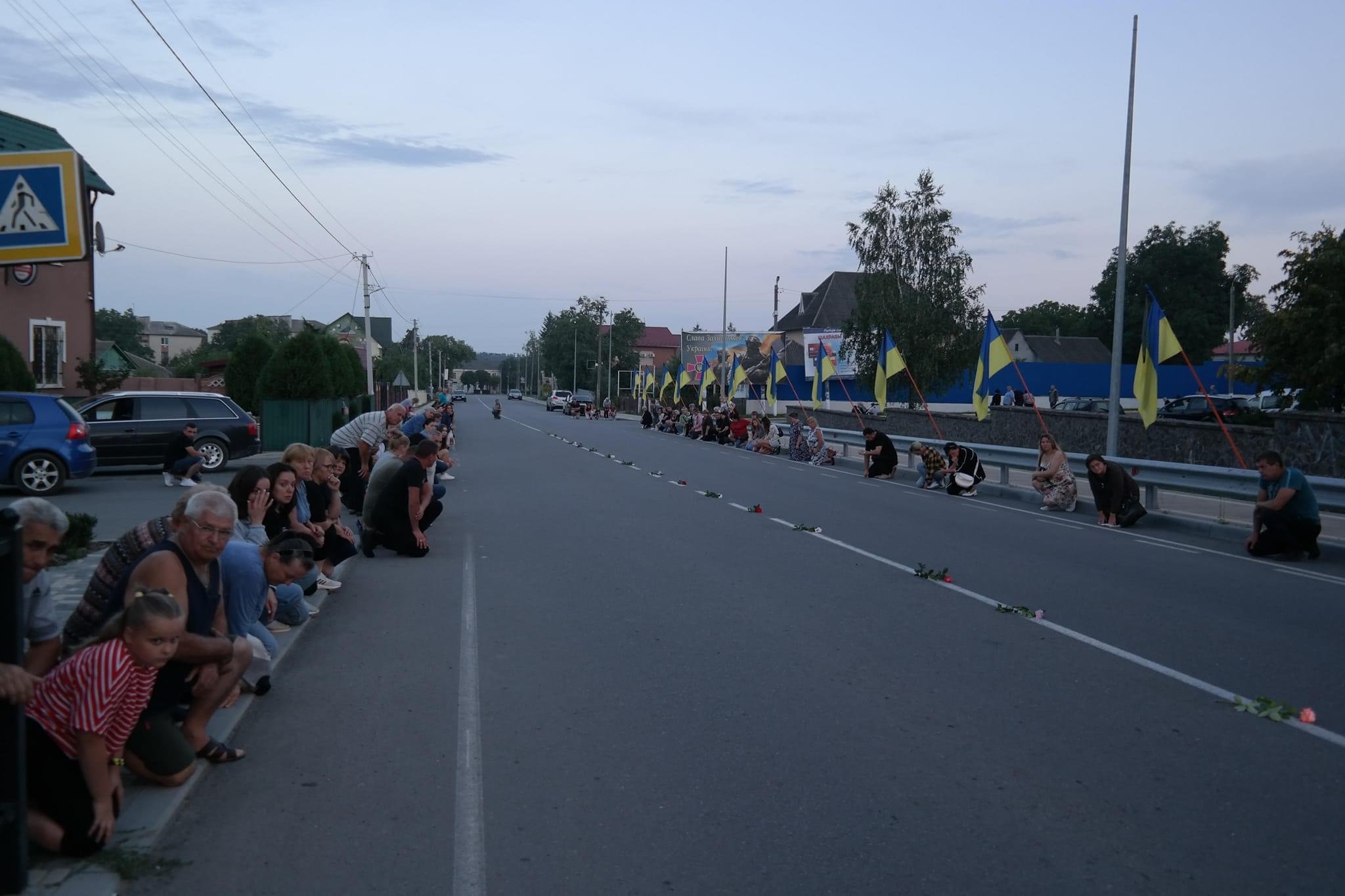 З безмежною вдячністю та глибокою скорботою, з живими квітами та прапорами, стоячи навколішки, жителі громади зустрічали траурну колону вздовж автошляхів краю.