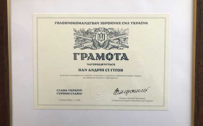 Днями Андрій Іванович отримав грамоту головнокомандувача Збройних сил України Валерія Залужного – за активну громадянську позицію, патріотизм та допомогу Збройним силам України. Грамоту вручили представники Чернівецького обласного територіального центру комплектування та соціальної підтримки.