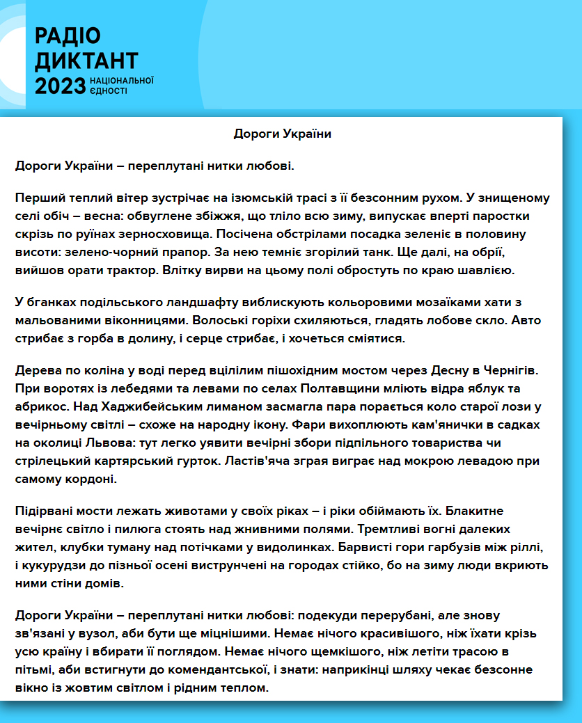 «Дороги України» – оприлюднено текст Радіодиктанту 2023