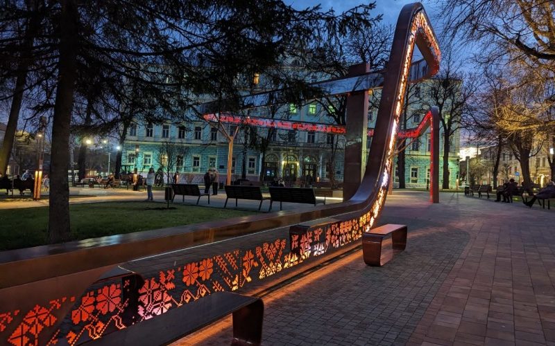 В оновленому сквері Дня вишиванки у Чернівцях встановили світловий елемент у вигляді стрічки.