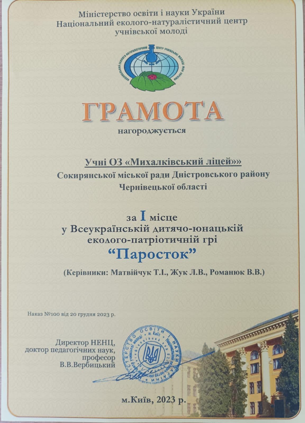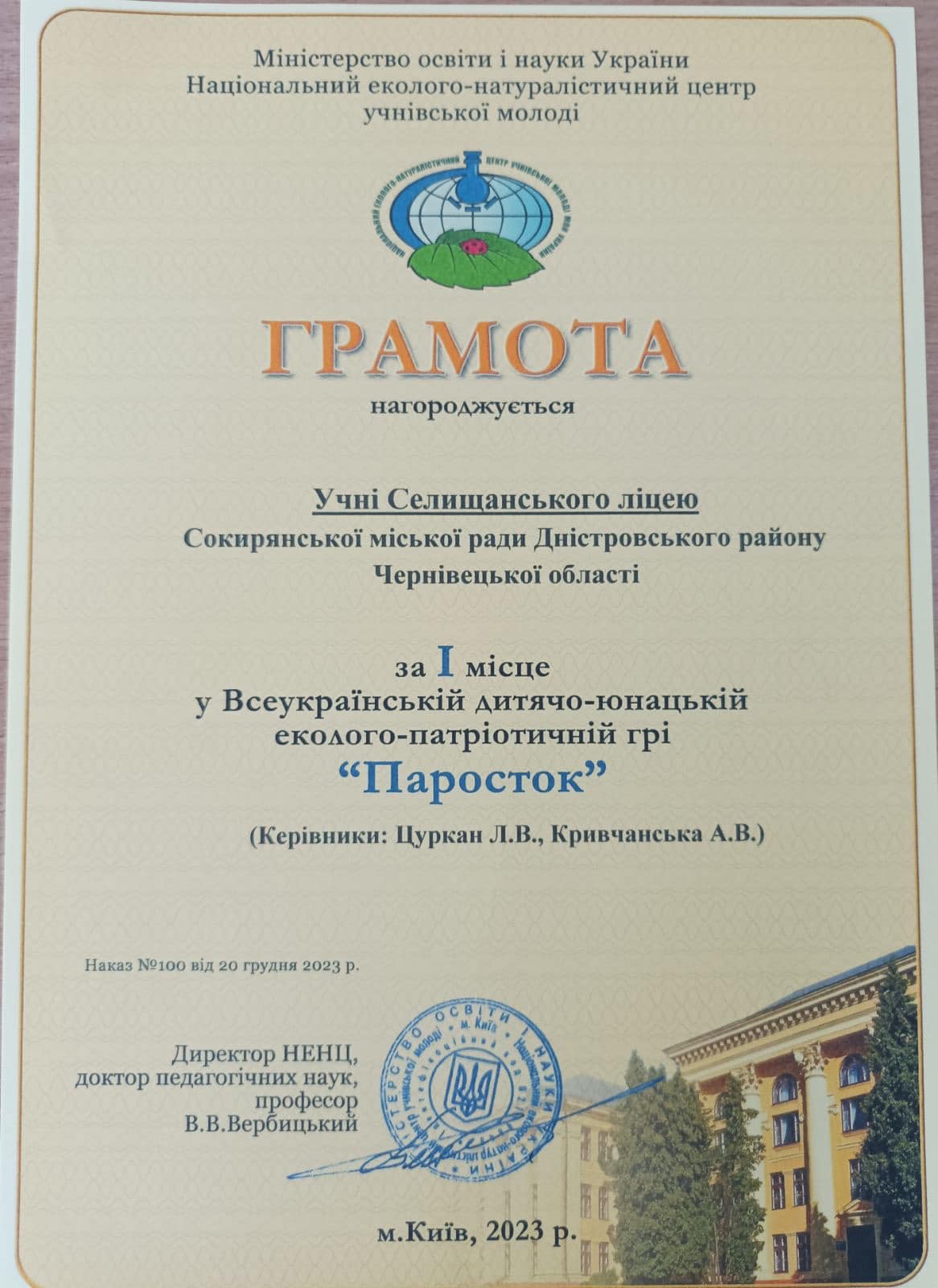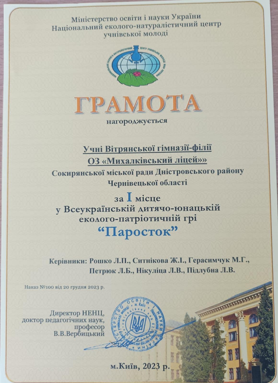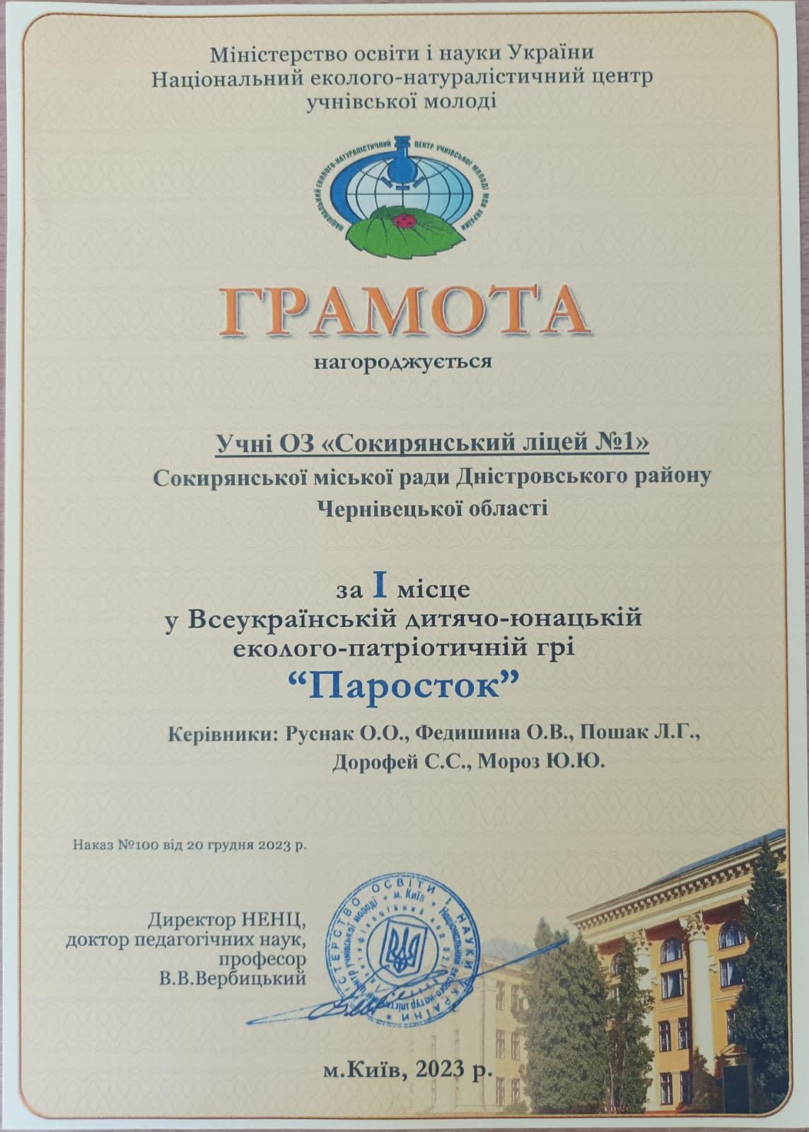 Вітаємо юних патріотів Сокирянщини із перемогою у Всеукраїнській дитячо-юнацькій еколого-патріотичній грі «Паросток»!
