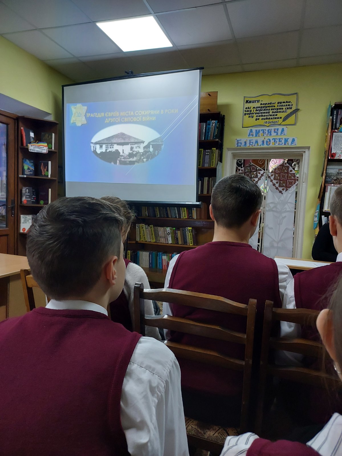Напередодні Сокирянська центральна бібліотека приєдналася до вшанування цієї скорботної дати. В приміщенні книгозбірні проведена година скорботи «Голокост – біль і жах усього людства…», на яку завітали учні 8-А класу Сокирянського ліцею спільно з вчителем історії Кучерявою Людмилою Миколаївною.