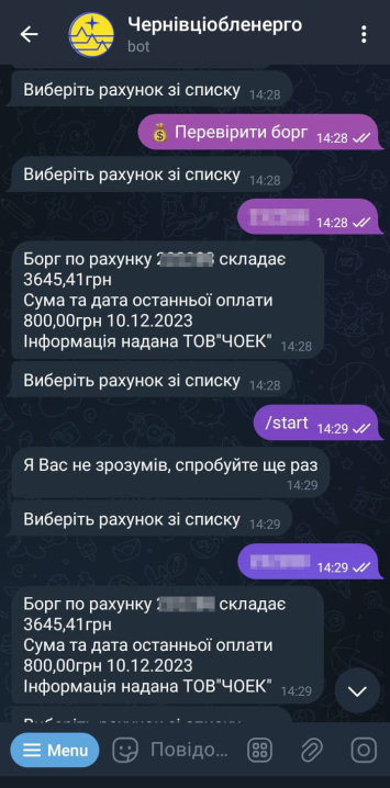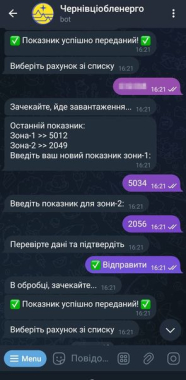 Як сумлінний споживач виконала свій обов’язок і передала показники через чатбот АТ “Чернівціобленерго” 31 січня. Зазвичай я передаю за себе і за свою сусідку-пенсіонерку. Все, як завжди, пройшло чудово, це видно на першому фото.
