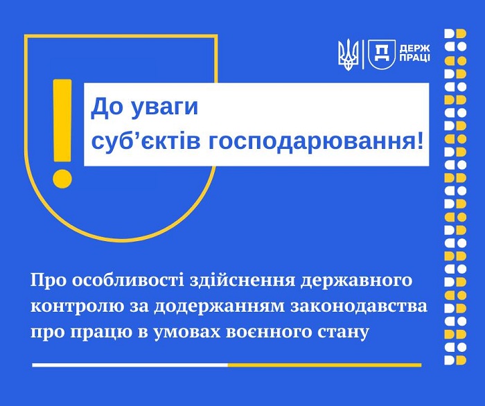 Державна служба України з питань праці звертає увагу суб’єктів господарювання, що в умовах воєнного стану особливості здійснення державного контролю та притягнення до відповідальності роботодавців за порушення законодавства про працю встановлені Законом України «Про організацію трудових відносин в умовах воєнного стану».