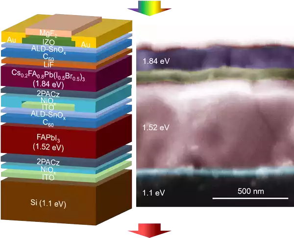 Досі багатоперехідні фотоелементи на основі перовськітів відставали за продуктивністю від монолітних двоперехідних осередків, оскільки вимагали складної багатошарової архітектури та системи керування світлом та струмом. Німецьким ученим вдалося розробити триперехідний сонячний елемент із рекордною для свого типу ефективністю перетворення — 24,4%. Два верхні його шари перовськітові, нижній з кремнію.