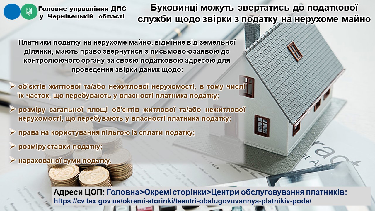 Фахівці Головного управління ДПС у Чернівецькій області інформують, що відповідно до п.п.266.7.1 п.266.7 ст.266 ПКУ, обчислення суми податку з об’єктів житлової та нежитлової нерухомості, які перебувають у власності фізичних осіб здійснюється контролюючим органом за місцем податкової адреси (місцем реєстрації) власника такої нерухомості.