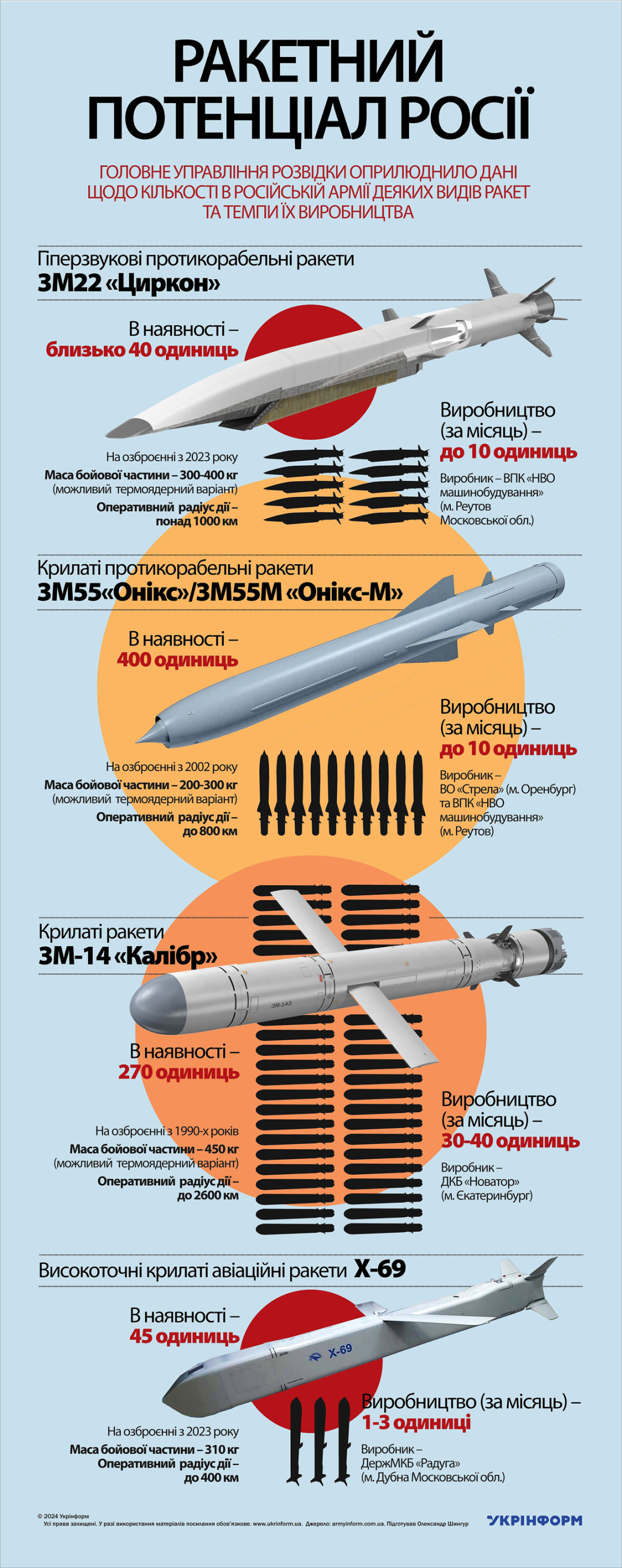 Головне управління розвідки оприлюднило дані щодо кількості в російській армії деяких видів ракет та темпи їх виробництва