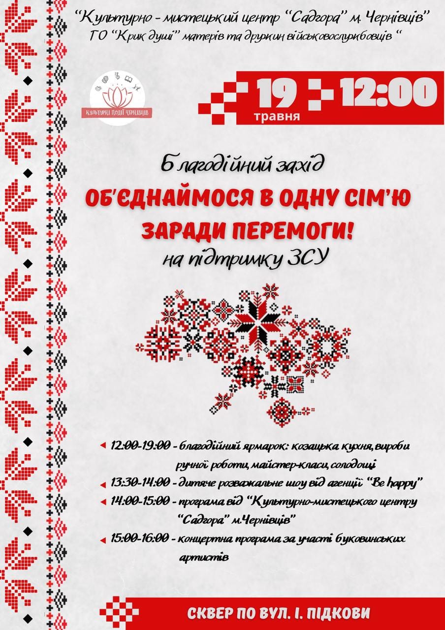 У Чернівцях відбудеться благодійний захід «Об’єднаймося в одну сім’ю заради перемоги», на якому збиратимуть кошти на потреби Збройних сил України.