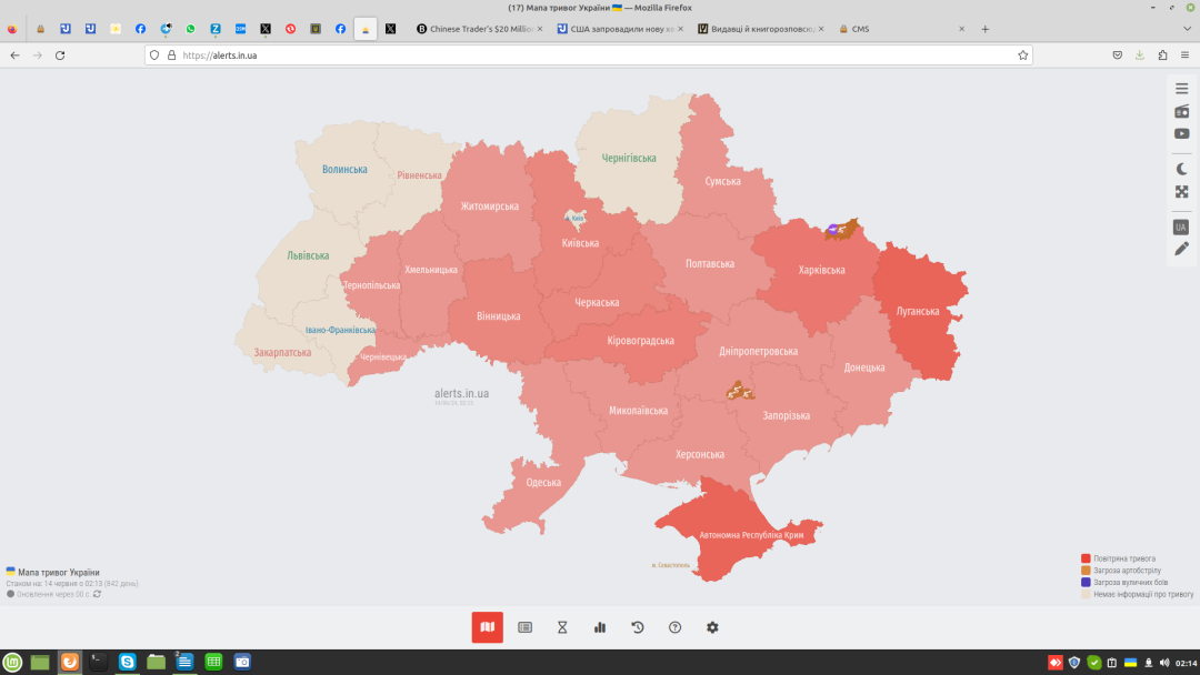 Наразі повітряну тривогу оголосили у більшості областей України, за винятком Чернігівської та західних, а також Києва.