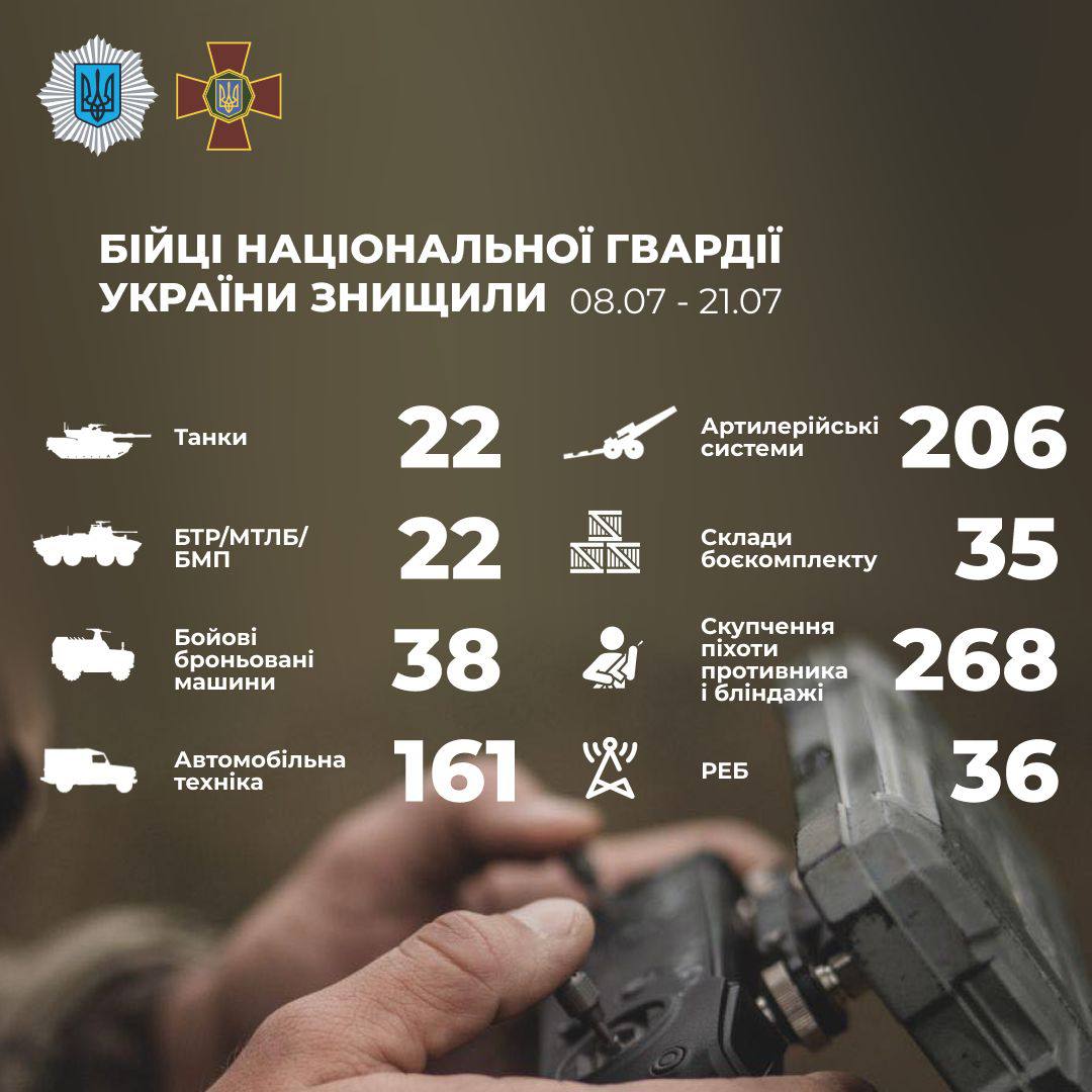 Крім того, за його даними, нацгвардійці знищили за два тижні 206 ворожих артилерійських систем; 161 автомобіль; 36 засобів РЕБ; 35 складів ворожого боєкомплекту.