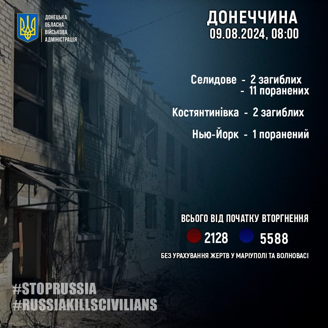 "За 8 серпня росіяни вбили чотирьох жителів Донеччини: двох у Селидовому і двох у Костянтинівці", – йдеться у повідомленні.