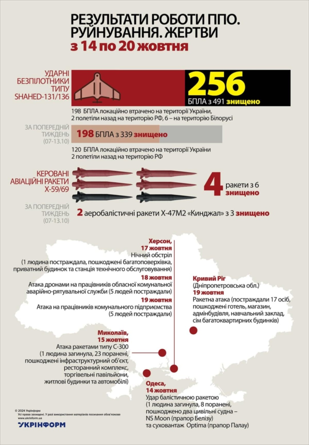 Внаслідок обстрілів російськими окупантами з 14.10 по 20.10 Донецької, Херсонської, Запорізької, Сумської, Дніпропетровської та Харківської областей 16 людей загинуло, 68 отримали поранення.