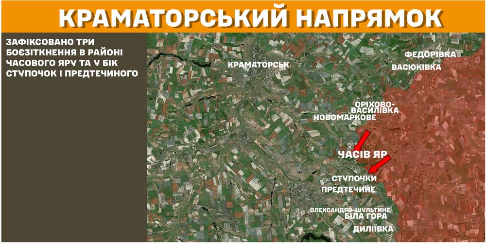На Краматорському напрямку було зафіксовано три боєзіткнення в районі Часового Яру та у бік Ступочок і Предтечиного.