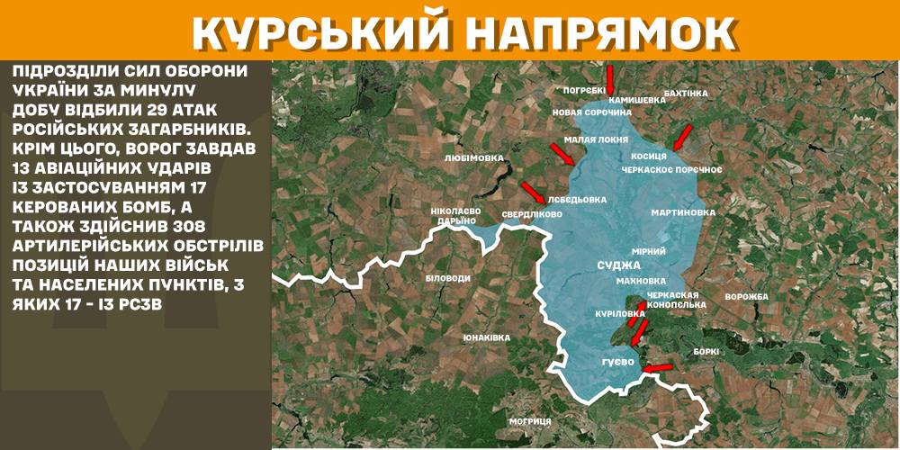 У операційній зоні на Курщині підрозділи Сил оборони України за минулу добу відбили 29 атак росіян. Окрім цього, ворог завдав 13 авіаударів із застосуванням 17 керованих бомб, а також здійснив 308 артилерійських обстрілів позицій українських військ та населених пунктів, з яких 17 – із РСЗВ.