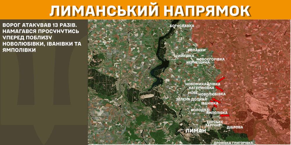 На Лиманському напрямку ворог атакував 13 разів – намагався просунутись уперед поблизу Новолюбівки, Іванівки та Ямполівки.
