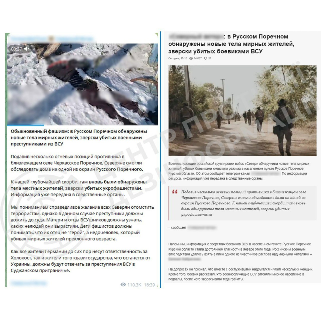 «Російська пропаганда вкотре поширює дезінформацію про нібито убивства цивільних у селі Руське Порічне на Курщині. Як докази ru-пропаганда поширює відео, на якому зафільмовано тіла кількох загиблих людей. Поширене відео не містить жодних справжніх доказів. З нього неможливо встановити ані кількість тіл, ані місце подій, ані особи загиблих, ані причини та обставини їхньої смерті», – заявляє ЦПД.