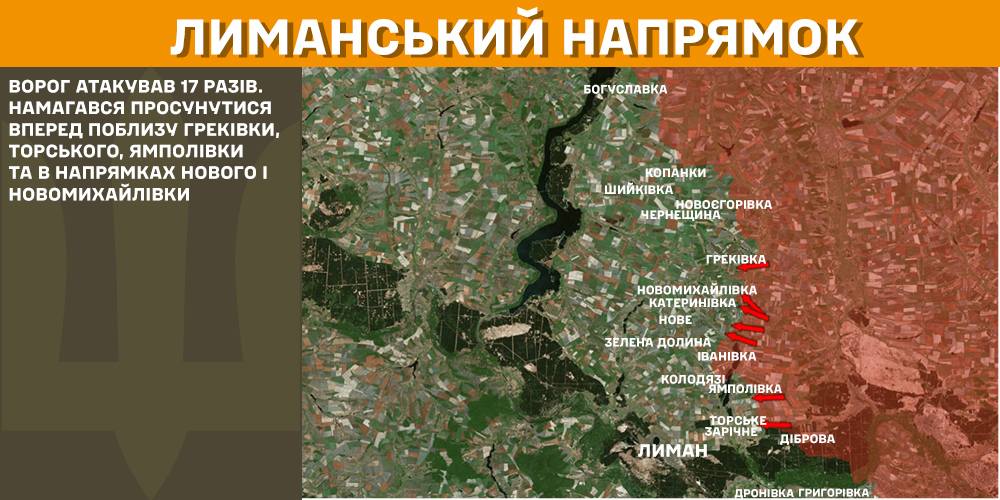 На Лиманському напрямку ворог атакував 17 разів. Намагався просунутися поблизу Греківки, Торського, Ямполівки та в напрямках Нового і Новомихайлівки.