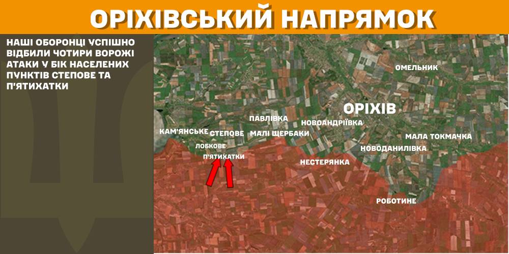 На Оріхівському напрямку українські війська успішно відбили чотири ворожі атаки у бік Степового та П’ятихаток.