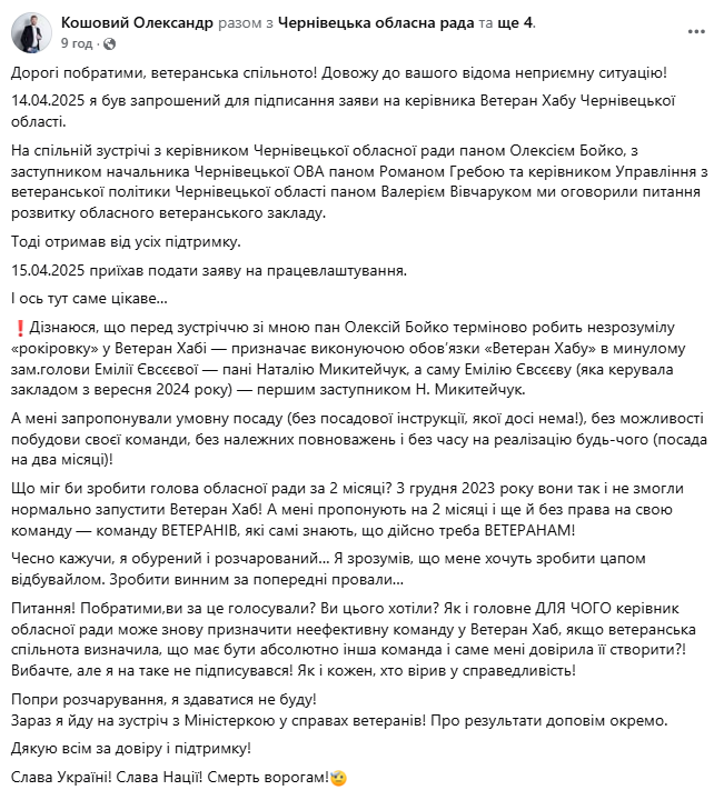 «З грудня 2023 року вони так і не змогли нормально запустити Ветеран Хаб, а мені пропонують на 2 місяці, ще й без права на свою команду — команду ветеранів, які самі знають, що дійсно треба ветеранам!», — написав Кошовий.
