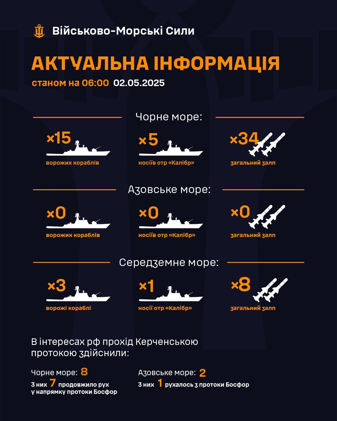 Про це повідомляє Укрінформ з посиланням на оперативну інформацію ВМС України станом на 06:00 02.05.2025 у Фейсбуці.