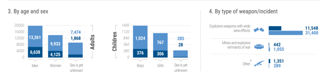 "Жертви серед цивільного населення у травні були зареєстровані у 17 областях України та Києві, включаючи райони, розташовані далеко від лінії фронту. 28% цивільних загинули внаслідок ракетних ударів та баражуючих боєприпасів. Така ж частка жертв була спричинена атаками дронів малої дальності. Через артилерійські обстріли та удари РСЗВ загинув 21% цивільних, а внаслідок повітряних бомбардувань – 18%", – поінформували в ООН.