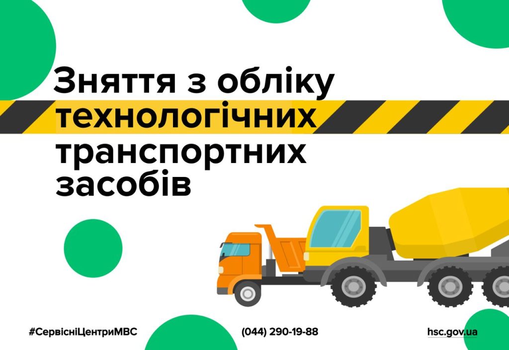 Звертаємо увагу, що технологічні транспортні засоби, які вивозяться за кордон, знімаються з обліку виключно після проведення експертного дослідження ідентифікаційних номерів складових частин (вузлів та агрегатів) технологічного транспортного засобу. У свідоцтві про реєстрацію або на копії реєстраційної картки, що додається до свідоцтва про реєстрацію технологічних транспортних засобів, знятих з обліку у зв’язку із вивезенням за кордон, робиться запис: «Знято з обліку для вивезення за кордон». Відомості про зняті з обліку технологічні транспортні засоби вносяться до Єдиного державного реєстру транспортних засобів.