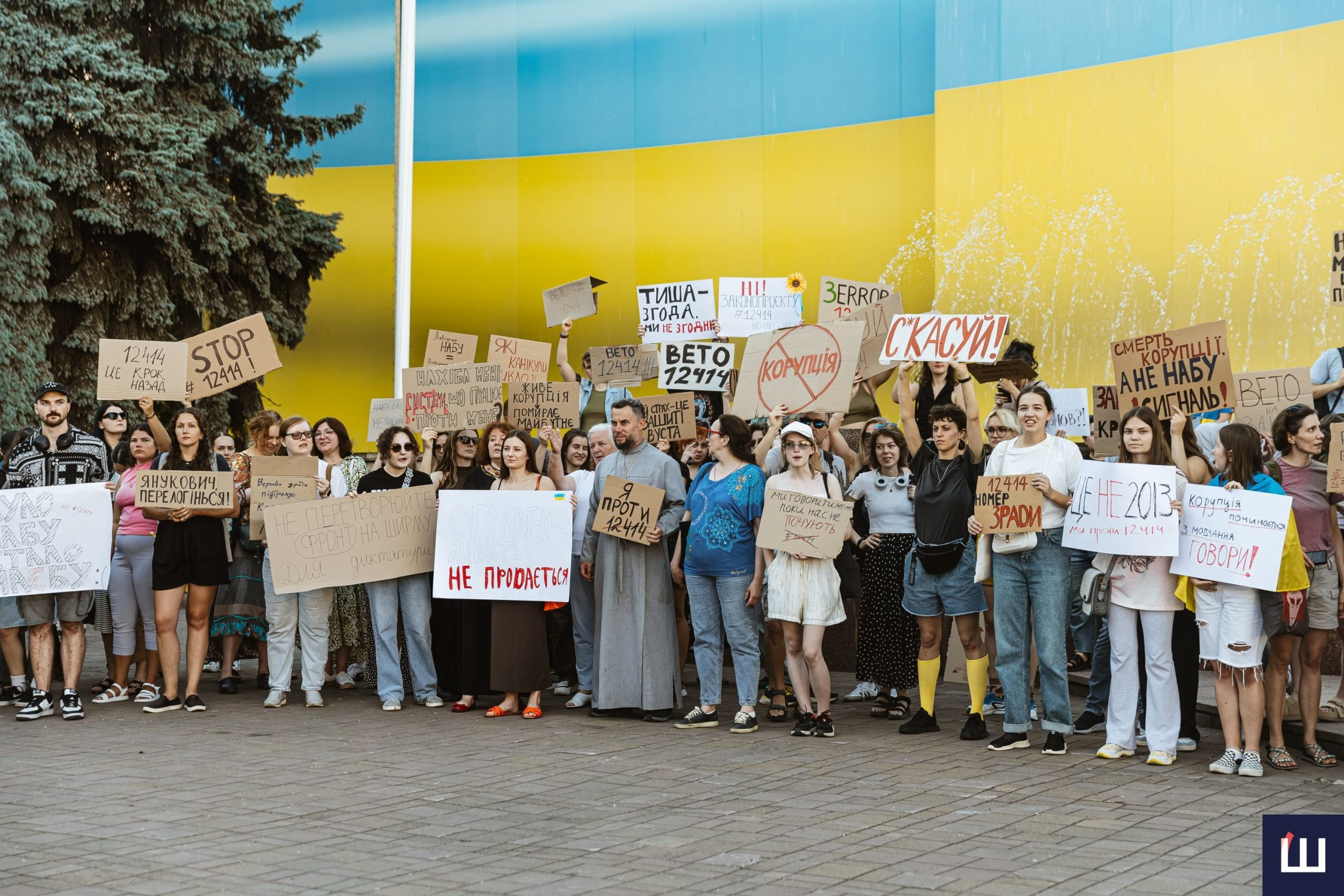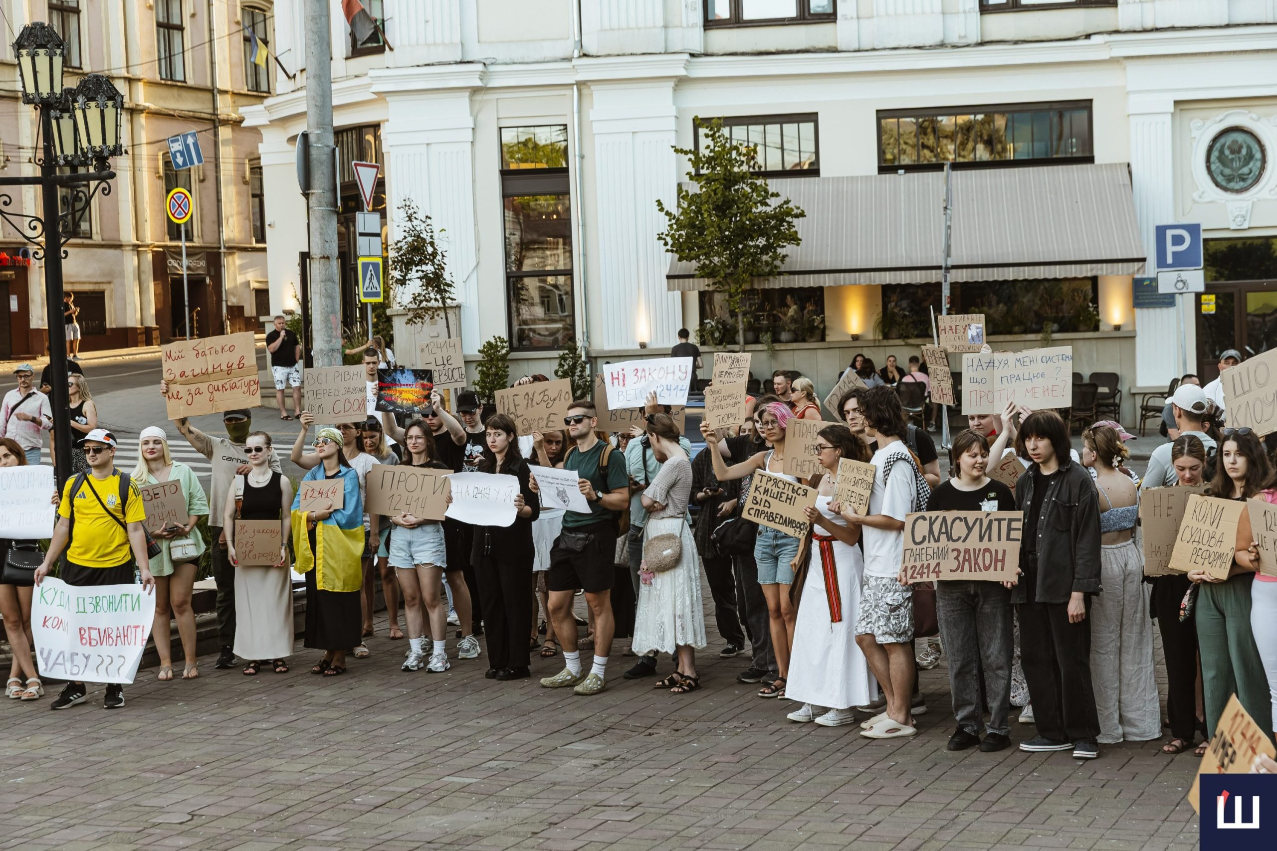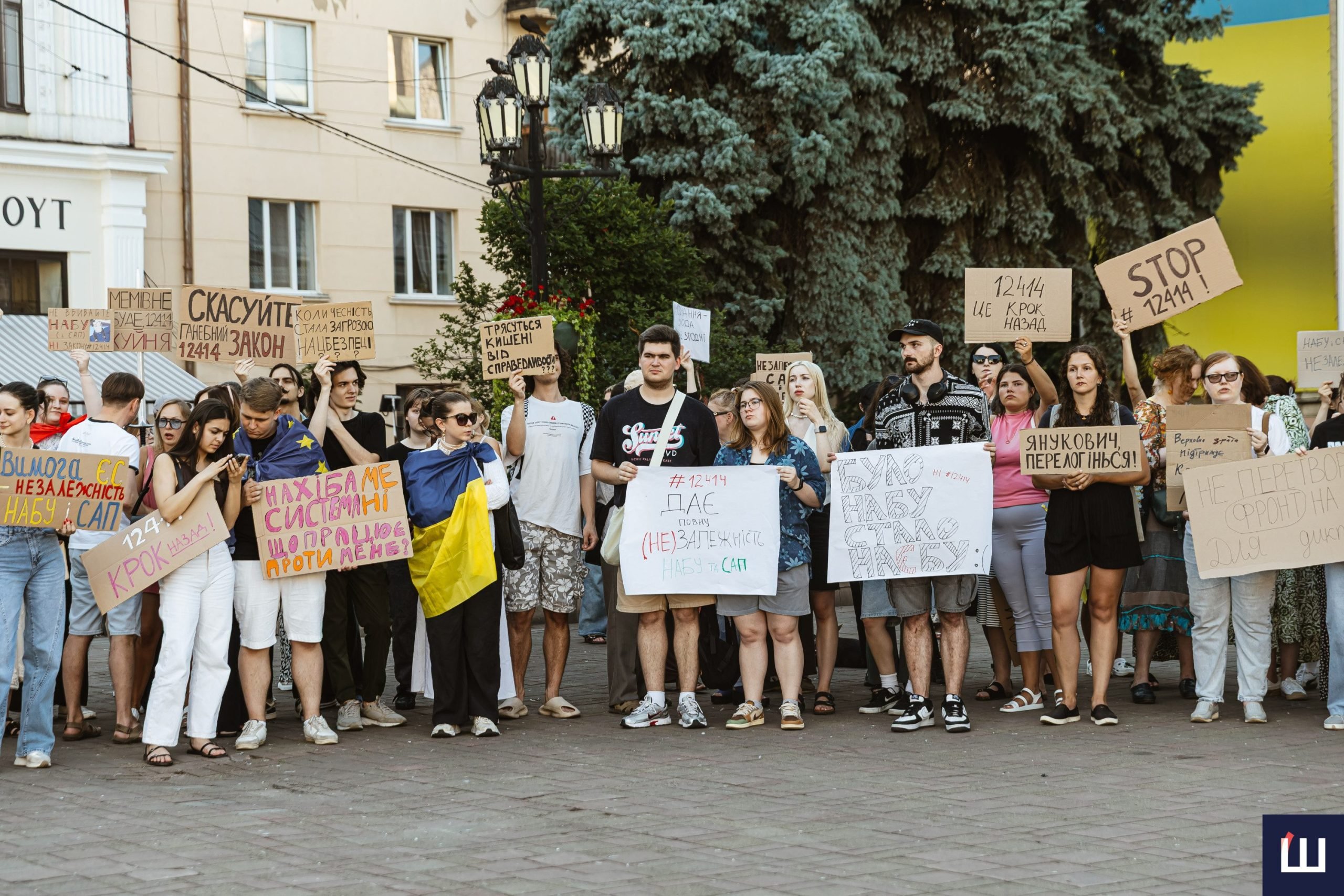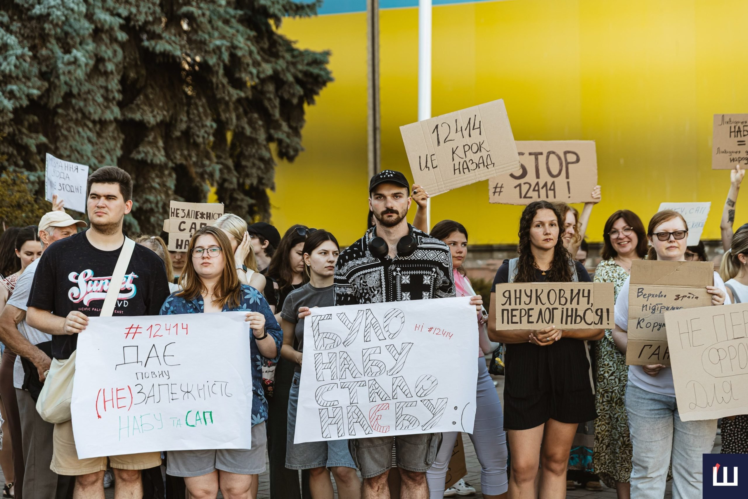 Протестувальники вигукували гасла «незалежність НАБУ та САП», «ні – закону №12414», «жодних рішень без народу», «демократія – це не декорація» та інші.