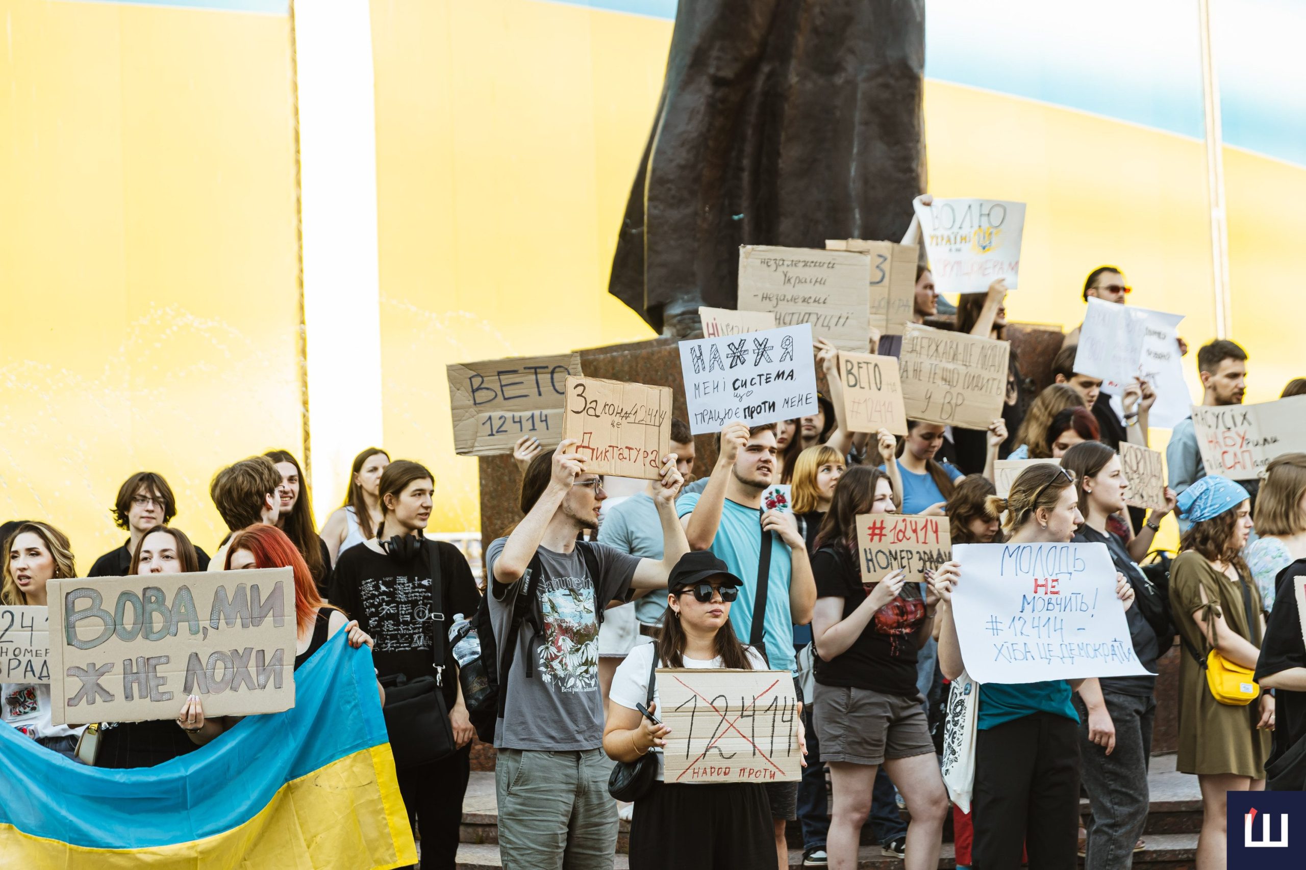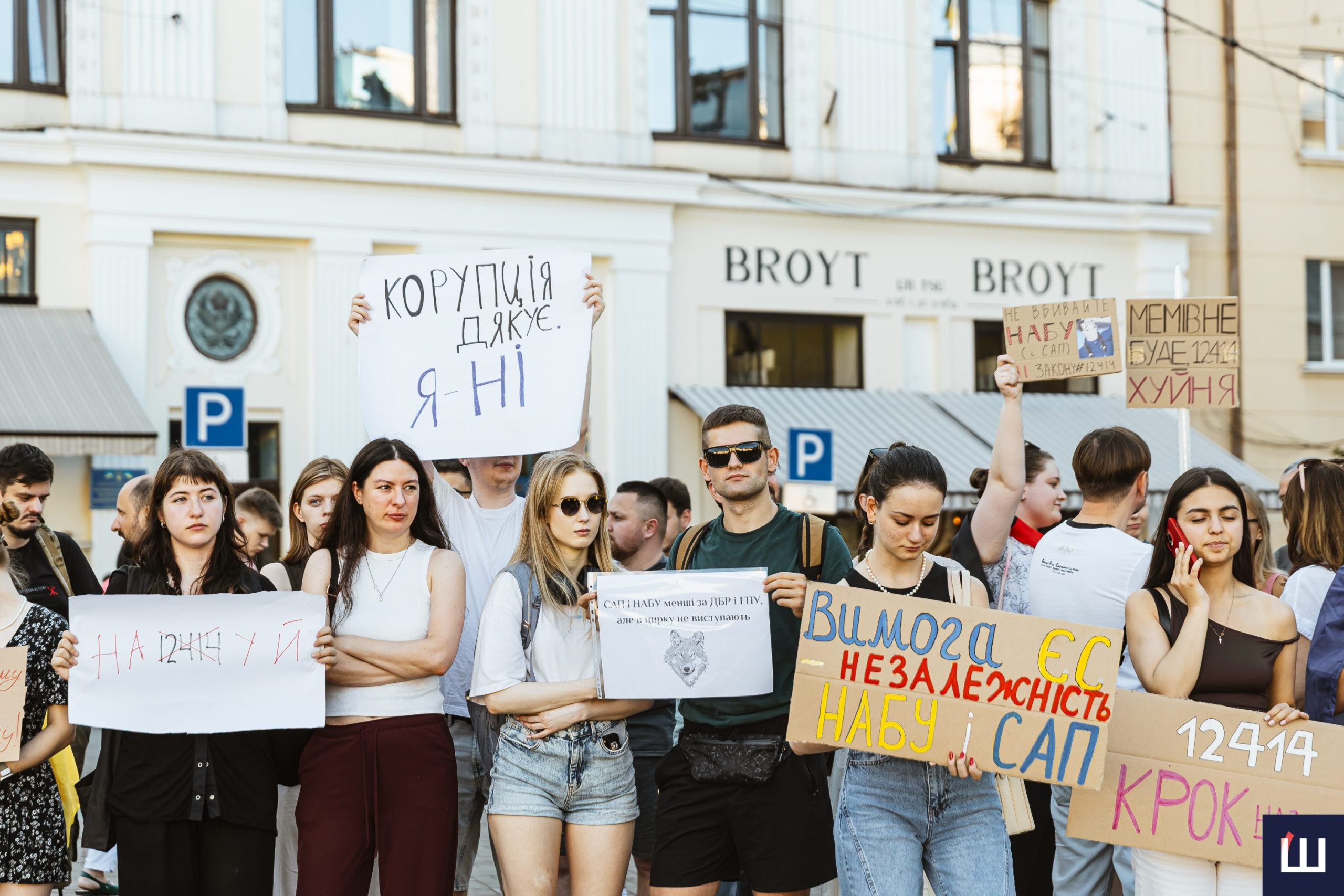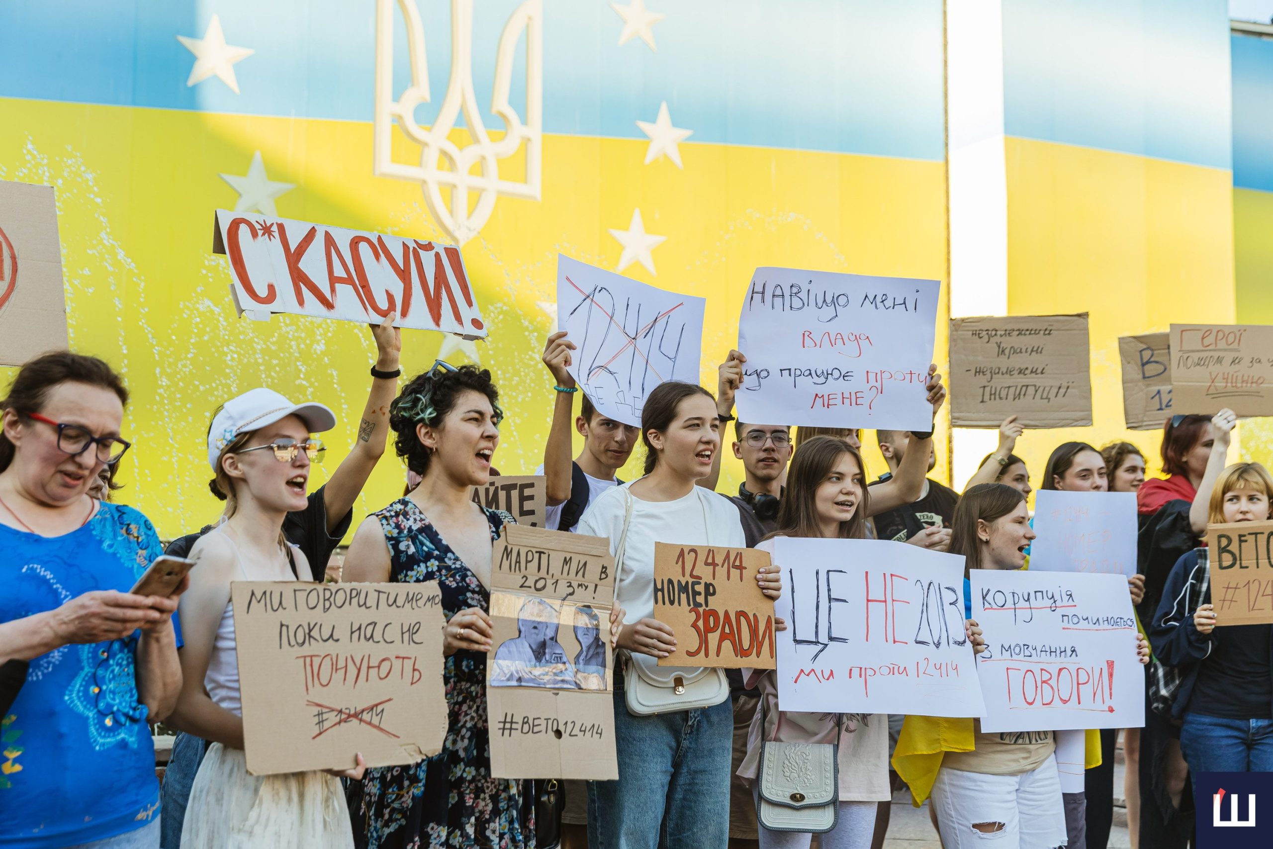 Протестувальники вигукували гасла «незалежність НАБУ та САП», «ні – закону №12414», «жодних рішень без народу», «демократія – це не декорація» та інші.