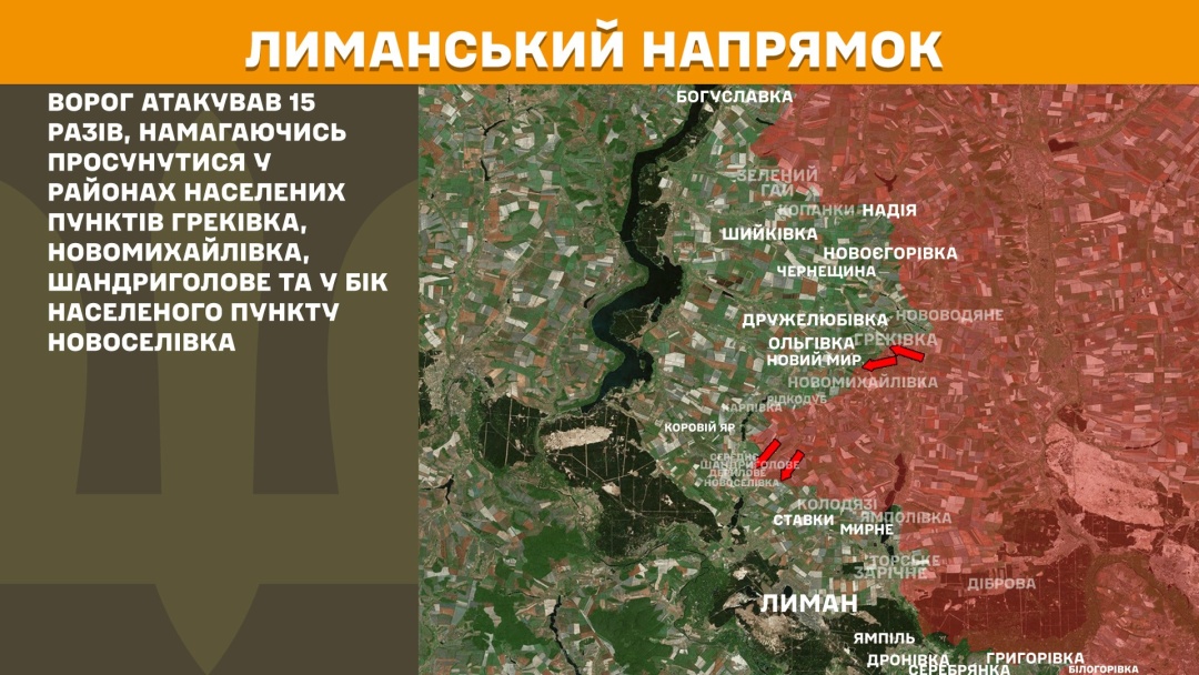 На Лиманському напрямку ворог атакував 15 разів, намагаючись просунутися у районах Греківки, Новомихайлівки, Шандриголового та у бік Новоселівки.