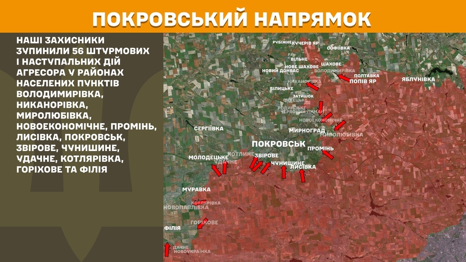 На Покровському напрямку захисники України зупинили 56 штурмових і наступальних дій армії РФ у районах Володимирівки, Никанорівки, Миролюбівки, Новоекономічного, Променя, Лисівки, Покровська, Звірового, Чунишиного, Удачного, Котлярівки, Горіхового та Філії.