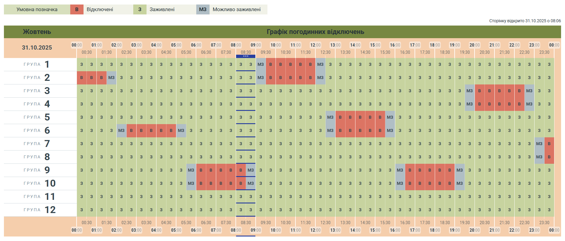 Як зазначають в обленерго, у графіку погодинних вимкнень відображаються години гарантованого ввімкнення електроенергії (зелені клітинки) та години, коли ваші оселі будуть точно знеструмлені (позначені червоним кольором).