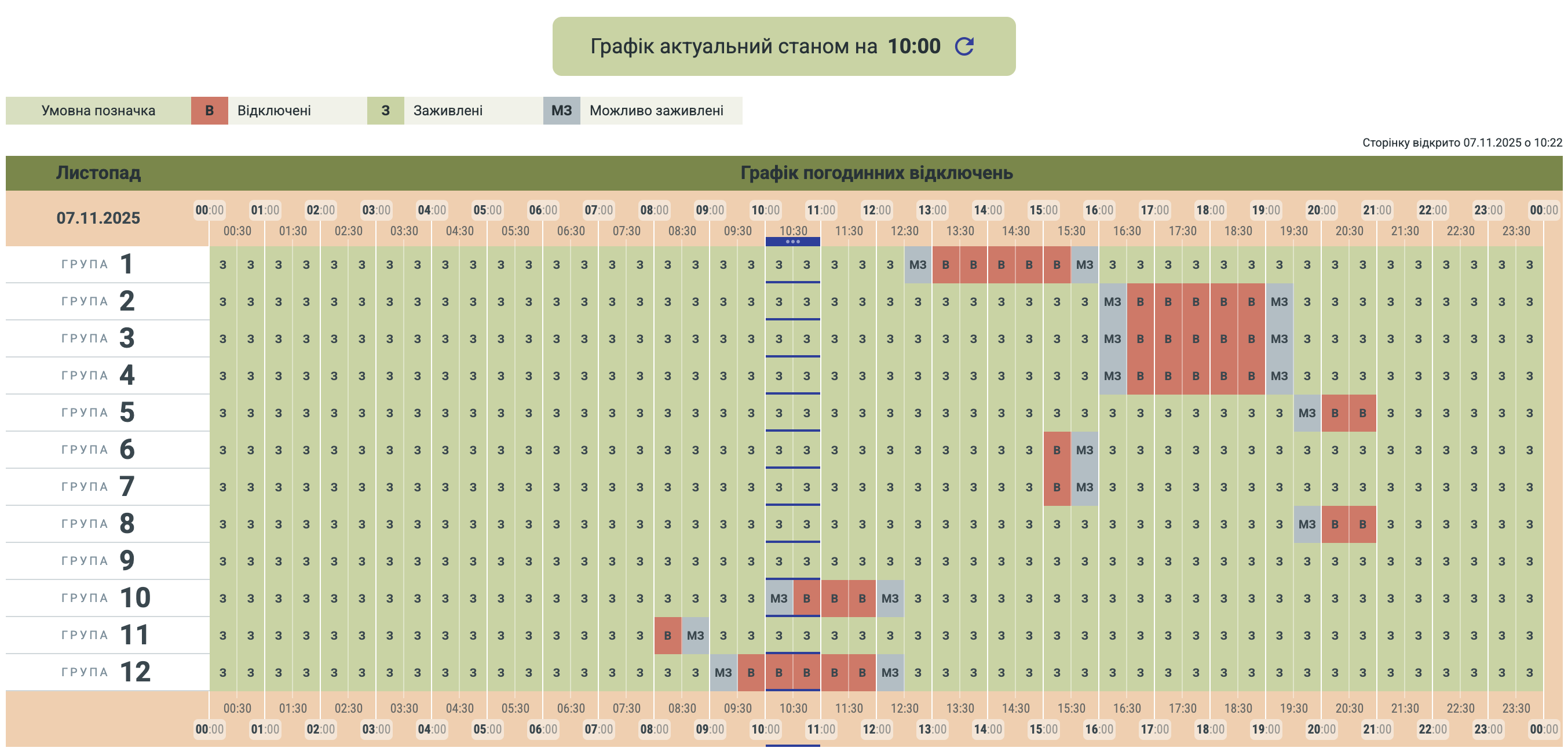 У графіку погодинних вимкнень відображаються години гарантованого ввімкнення електроенергії та години, коли ваші оселі будуть точно знеструмлені.